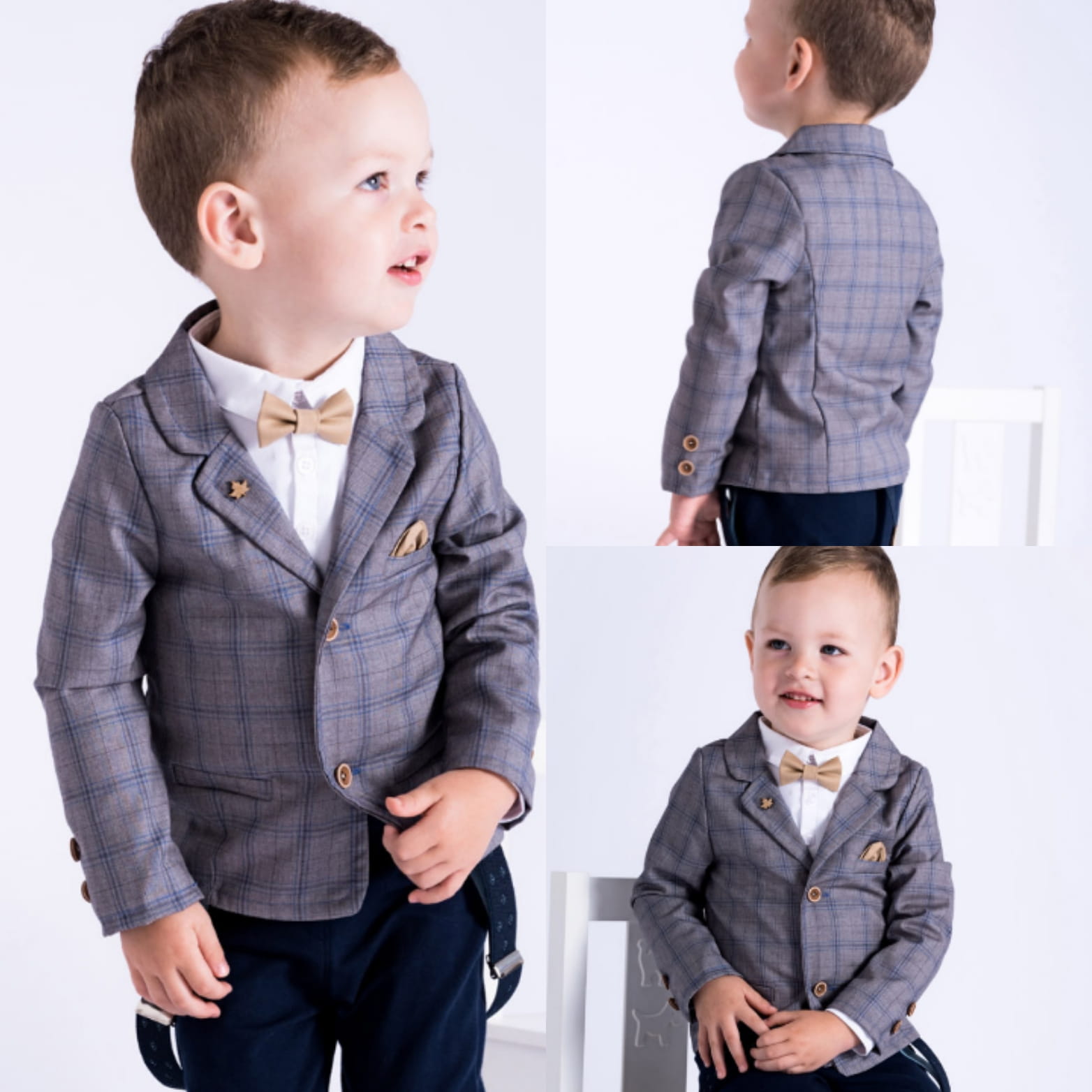 Garnitur składa się z marynarki, spodni i muszki.